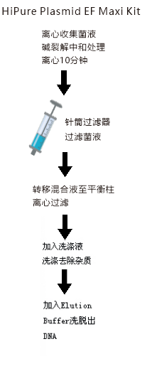 本试剂盒采用玻纤滤膜纯化技术,只需进行简单的结合-洗涤-洗脱的步骤。细菌经离心收集后,首先用碱裂法进行裂解中和,并通过离心去除蛋白质和基因组;上清液再经过带滤膜的注射器去除杂质和内毒素,然后将澄清的裂解物加到纯化柱中进行离心或抽滤,质粒DNA吸附在玻纤膜上;杂质经过两次清洗被去除,最后用少量洗脱液或水洗脱出纯化的DNA。 |