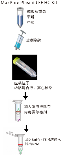 | 本试剂盒采用玻纤滤膜纯化技术,只需进行简单的结合-洗涤-洗脱的步骤。细菌经离心收集后,首先用碱裂法进行裂解中和,并通过离心去除蛋白质和基因组;上清液再经过纯化柱中进行离心或抽滤,质粒DNA吸附在玻纤膜上;杂质经过独特的去内毒素处理,以及清洗被去除,最后用少量洗脱液或水洗脱出纯化的DNA。 | |