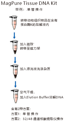 本试剂盒采用磁珠纯化技术,只需通过磁场就可以实现分离过程。血液等液体样品在裂解液和蛋白酶K的共同作用下裂解消化,DNA从胞内释放出来,加入结合液和磁珠进行混合,DNA被选择性地吸附到磁珠的表面,在磁场的作用下,磁珠被吸附和转移,蛋白质等杂质随废液一起去除。吸附DNA的磁珠经过清洗去除杂质,最后用少量洗脱液或水洗脱出DNA,磁珠在磁场作用分离去除。 |