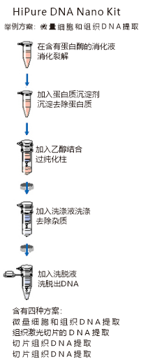 | HiPure DNA Nano Kit 采用硅胶柱纯化技术,简化了从痕量样本中分离DNA的步骤。无需苯酚-氯仿抽提和醇类沉淀DNA。样品经蛋白酶消化后,转移柱子后离心,DNA特异性结合到HiPure硅胶膜上,让污染物流过。PCR抑制物如二价阳离子和蛋白,可通过两步有效的洗涤步骤被完全去除,结合在离心柱上的纯DNA可用水或试剂盒中的缓冲液洗脱。HiPure DNA Nano Kit从痕量样本(1-100个细胞)中纯化得到基因组DNA和线粒体DNA,可用于 PCR和印迹实验中。 HiPure DNA Micro Kit具备硅胶膜选择性结合DNA的特性和小量的洗脱体积(7ul)。操作流程适用于处理痕量细胞1-100个。 |