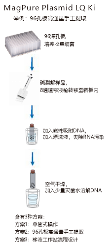 本试剂盒采用磁珠纯化技术,适合于从1-3ml培养液中提取高达20ug的质粒DNA。得到的质粒DNA可用测序、酶切、连接,克隆,PCR等应用。提取过程无需接触有毒酚氯仿有机物抽提,也需要用到耗时的离心步骤。高通量提取操作可以通过96孔磁力架和96振荡仪实现,可以核酸提取仪上(如KingFisherFle, MagMix32, MagMix 96)进行高通量提取,还可以配合移液工作站(Hamilton, Tican)进行自动化提取。整个提取可以在20分钟内完成。 |