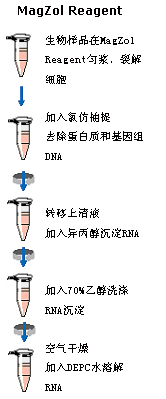 | MagZol Reagent为单一相的溶液,含有异硫氰酸胍和酸性酚。该试剂是一步法酸性酚异硫氰酸胍RNA提取方案的改良而成(Piort Chemczychi, 1987)。MagZol Reagent可快速裂解细胞/组织,让RNA释放至溶液中,以此同时,试剂中含有的异硫氰酸胍和酚可快速失活各种核酸酶,保护RNA不发生降解。经过氯仿抽提后形成三相体系,其中RNA分布于水相层,DNA和蛋白质分布中间层和有机层,达到分离RNA的目的。MagZol Reagent适合于从各种生物样品中快速提取总RNA。使用该方法纯化的RNA可直接用于RT-PCR、Northern杂交、Poly(A)富集等下游应用。此外,该试剂还可以用于DNA和蛋白质。 生物样品在MagZol Reagent中匀浆裂解后,室温保存一天,2-8℃保存一周,-20℃或-80℃长期保存。 |