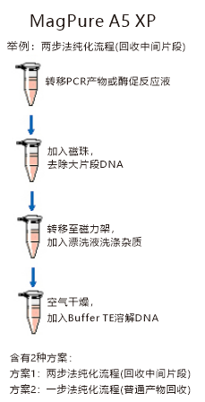 MagPure A4 XP为DNA产物,酶促反应的DNA片段选择性回收纯化提供一条快速的解决方案。试剂盒采用均一的弱离子交换磁珠纯化技术,适合于从DNA产物、限制性内切酶切体系、或其它酶促反应液中选择回收100bp-20Kbp DNA片段,MagPure A4 XP 采用独特的结合条件,可通过加入不同的体积MagPure A4 XP,可选择性回收不同的片段,特别适合引物二聚体严重的DNA产物,或为第二代测序准备DNA文库。