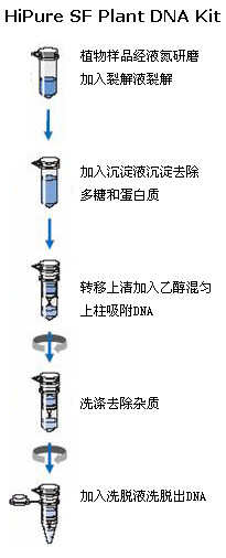 本试剂盒采用玻纤滤膜纯化技术,只需进行简单的结合-洗涤-洗脱的步骤。植物样品经物理方法研磨成粉未,加到含SDS和RNA酶试剂进行加温裂解,裂解液经高盐盐析沉淀多糖和蛋白质,离心得到澄清的裂解物,加入结合液调整最佳的结合条件后转移至纯化柱中并离心,DNA被选择性地结合到滤膜,而蛋白质等杂质由滤出到滤液中。经过两个洗涤步骤除去了残留的污染物和酶抑制剂,最后DNA被少量的水或缓冲液洗脱出来。 |
