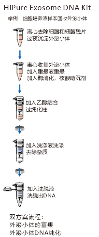 | 本试剂盒采用玻纤滤膜纯化技术,只需进行简单的结合-洗涤-洗脱的步骤。首先外泌小体(Exosome)的沉淀富集,外分泌小体在裂解液和蛋白酶K,以及载体RNA的共同作用下温育裂解消化,DNA从胞内释放出来,加入乙醇沉淀,再通过结合液调整最佳的结合条件后转移至纯化柱中并离心,DNA被选择性地结合到滤膜,而蛋白质等杂质由滤出到滤液中。经过两个洗涤步骤除去了残留的污染物和酶抑制剂,最后DNA被少量的水或缓冲液洗脱出来。 |