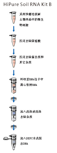 | 本试剂盒采用玻纤滤膜纯化技术,只需进行简单的结合-洗涤-洗脱的步骤。土壤等环境类样品在特殊的试剂和四种研磨珠的匀浆管中进行珠磨,RNA从胞内充分释放出来,进行抽提去除蛋白质、多糖和腐殖酸等杂质,离心得上清后加入结合液调整最佳的结合条件后转移至纯化柱中并离心,RNA被选择性地结合到滤膜,而杂质被滤出到滤液中。经过洗涤除去了残留的污染物和酶抑制剂,最后RNA被少量的水或缓冲液洗脱出来。 | |
