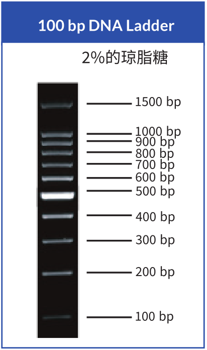 本产品由重组质粒经酶切获得,由1,500 bp、1,000 bp、900 bp、800 bp、700 bp、600 bp、500 bp、400 bp、300 bp、200 bp、100 bp共11条双链DNA组成,可作为琼脂糖凝胶电泳中双链线状DNA分子量大小的参照。其中500 bp为指示带,浓度约为150 ng/5 µL,其余条带浓度均为50 ng/5 µL。本品已混有上样缓冲液,可直接用于凝胶电泳。 |