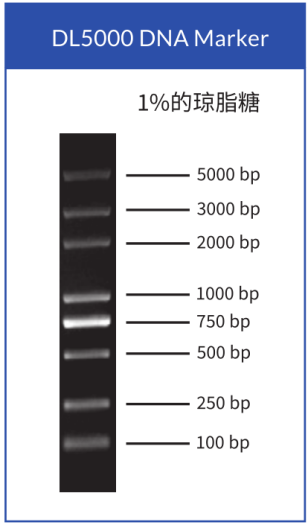 本产品由重组质粒经酶切获得,由5,000 bp、3,000 bp、2,000 bp、1,000 bp、750 bp、500 bp、250 bp、100 bp共8条双链DNA组成。其中750 bp为指示带,浓度约为150 ng/5 µL,其余条带浓度均为50 ng/5 µL。可作为琼脂糖凝胶电泳中双链线状DNA分子量大小的参照。本品已混有上样缓冲液,可直接用于凝胶电泳。 |